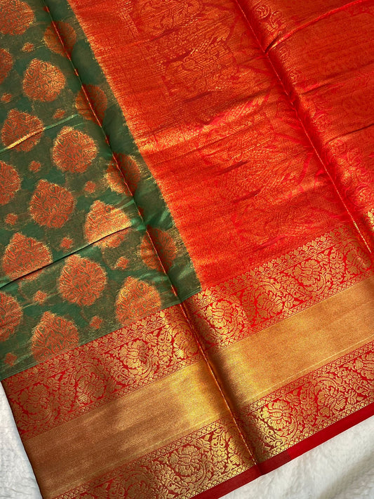 Green a d Dark Peach Grand Soft Silk Wedding and Party Wear Saree
