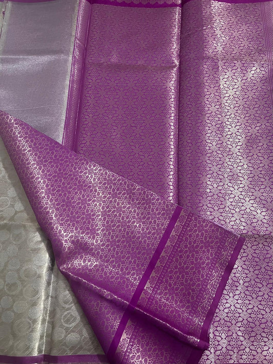 Half White and Purple Mangalyam Korvai Kottanji Tana Soft Silk Saree