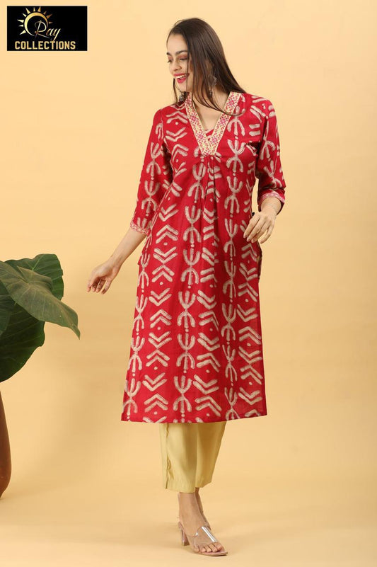 Sandal and Red V Neck 2-Piece Chudidar Set