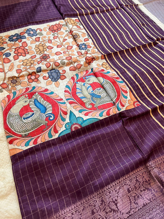 Sandal and Purple Kalamkari Silk Cotton Saree