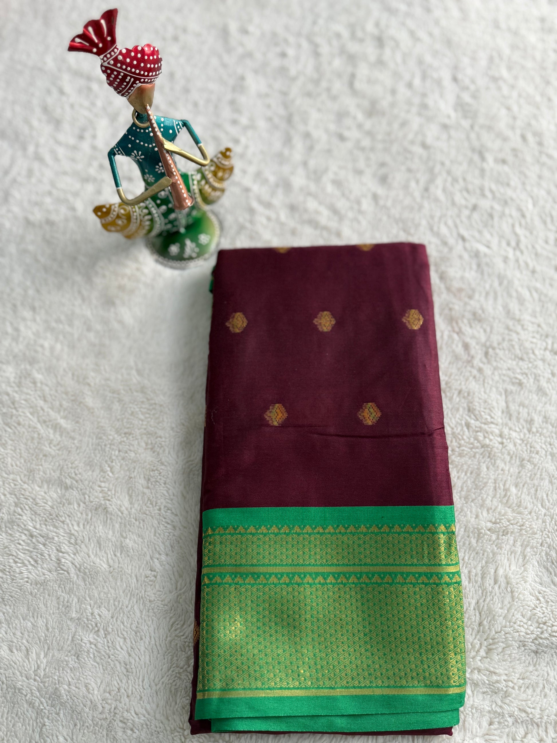 This Amolika semi silk saree exudes elegance with its lustrous finish, signature zari borders, and rich, solid colors. Known for its fine weave and minimalistic charm, this saree combines traditional craftsmanship with a timeless, sophisticated appeal, perfect for any occasion.