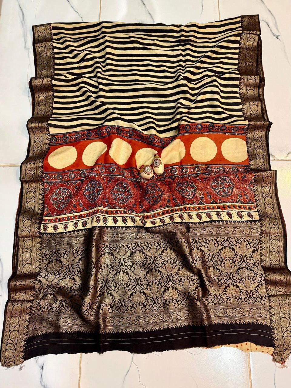 Black Stripe Ajrakh Print Pure Dola Silk Saree