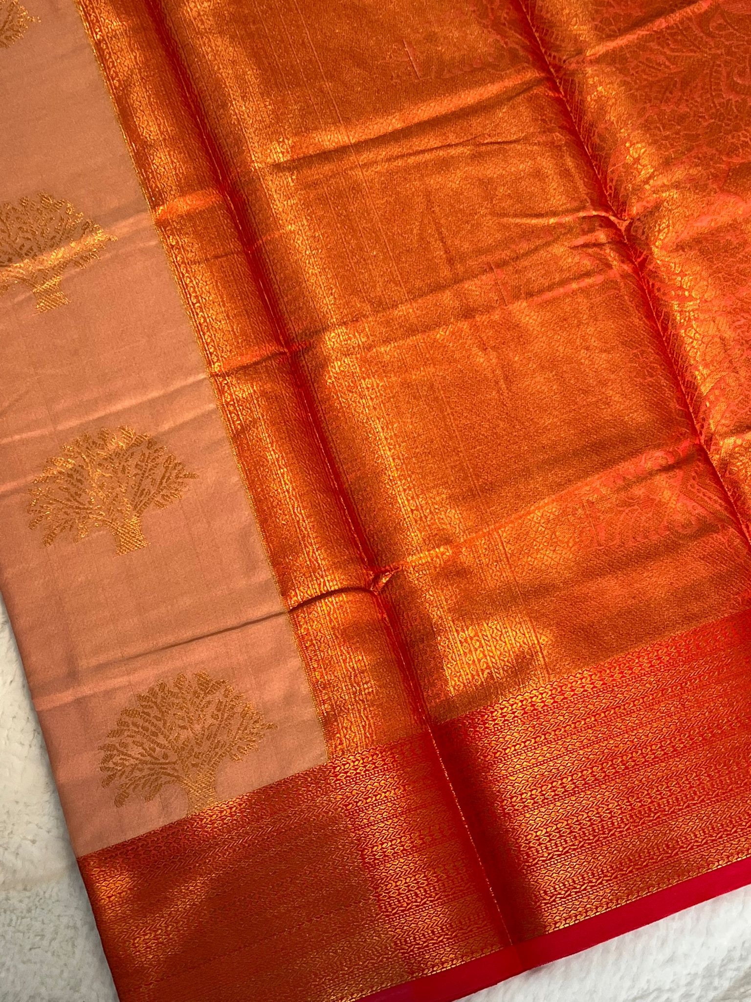 Expertly crafted from smooth butter silk, this saree boasts a rich and luxurious appearance. Adorned with beautiful tree puttas, the contrast pallu adds a touch of elegance. A budget-friendly option for those seeking a high-quality saree.
