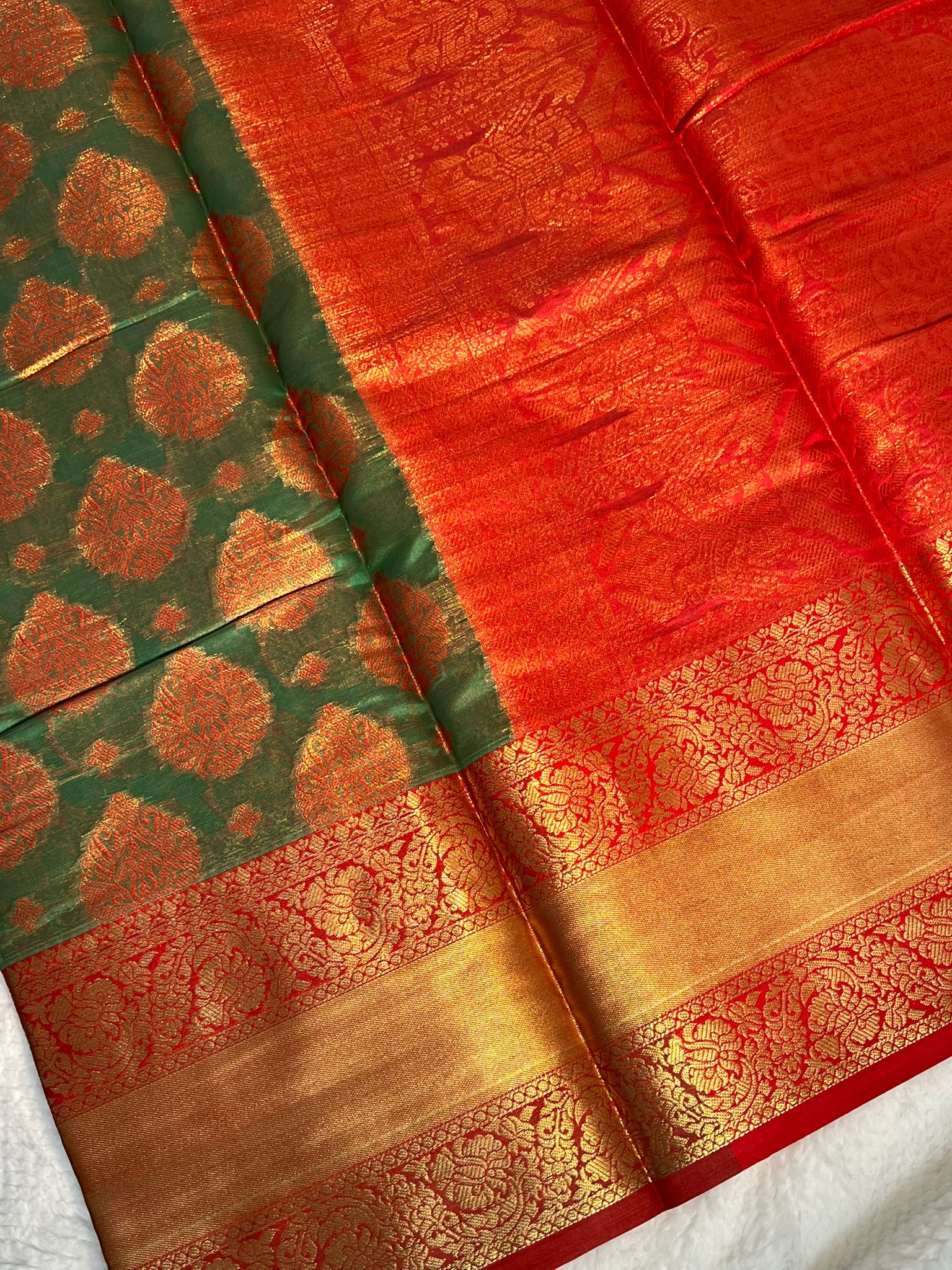 This Grand Ankita Silk Saree features unique and intricate big putta designs and a contrasting pallu, perfect for weddings and parties. Made from high-quality fabric, this saree exudes elegance and style. Elevate your wardrobe with this stunning and versatile piece.