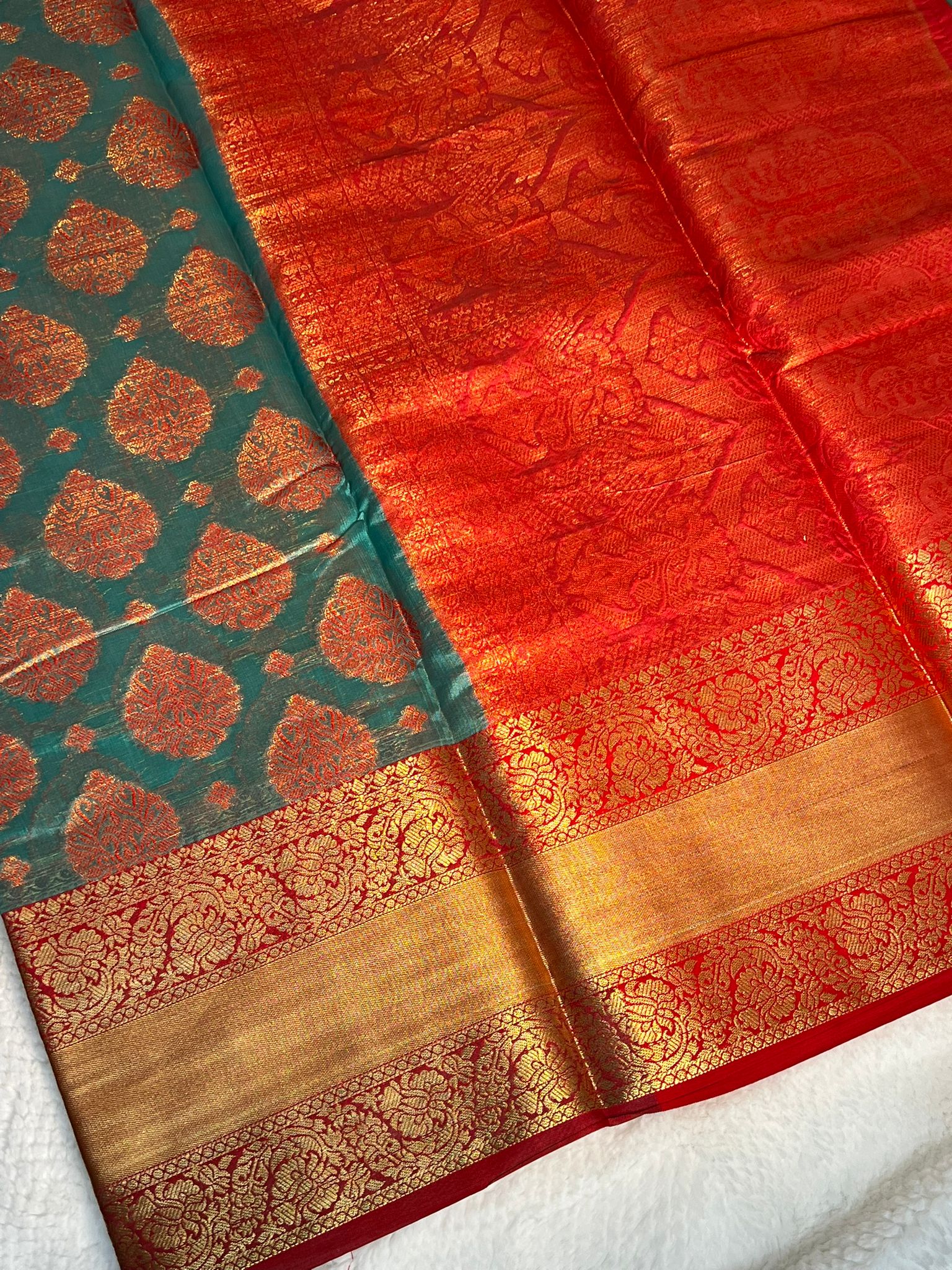 This Grand Ankita Silk Saree features unique and intricate big putta designs and a contrasting pallu, perfect for weddings and parties. Made from high-quality fabric, this saree exudes elegance and style. Elevate your wardrobe with this stunning and versatile piece.