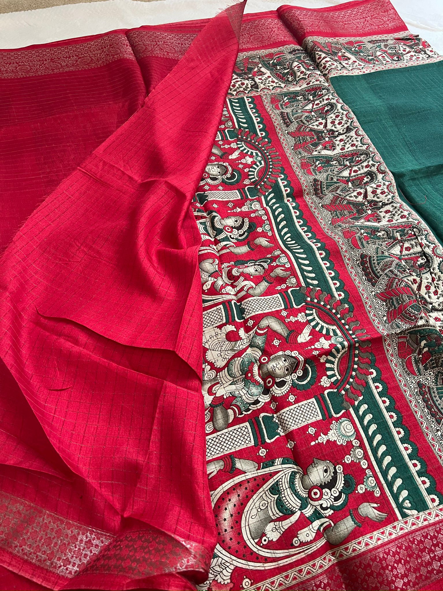 Expertly crafted with semi-silk material, the Emerald Saree features an artistic border and pallu adorned with figurine artwork. The contrast pallu and blouse add a touch of elegance to this fancy saree. Its light weight and easy drape make it a must-have for any special occasion.