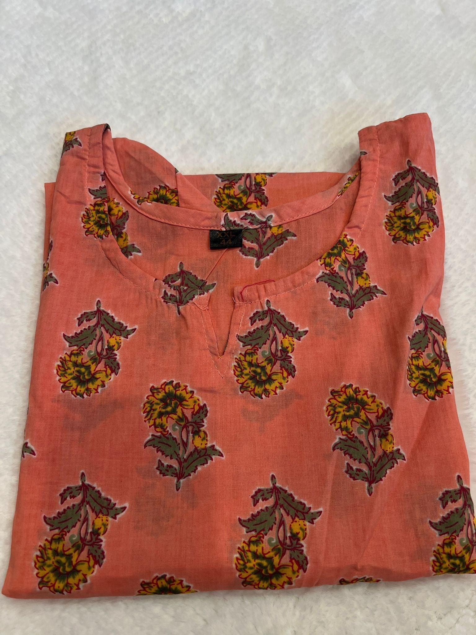 This short kurti offers a lightweight and breathable option for casual wear. Its versatile design pairs effortlessly with jeans or skirts, making it ideal for everyday comfort and style. Perfect for warm weather, it combines ease of movement with a chic, minimalist look.