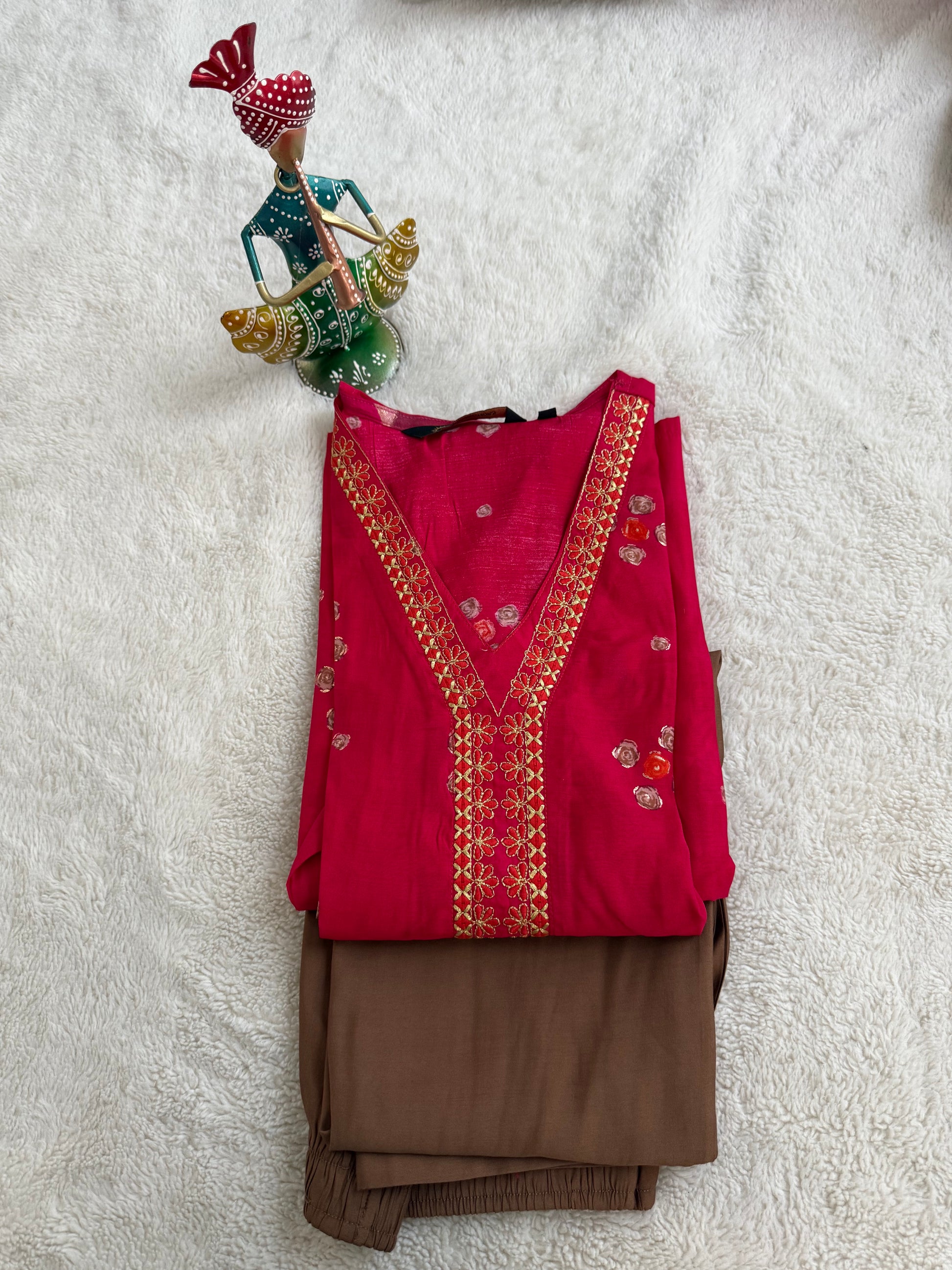 Pinkish Red with Brown V Neck 2-Piece Chudidar Set