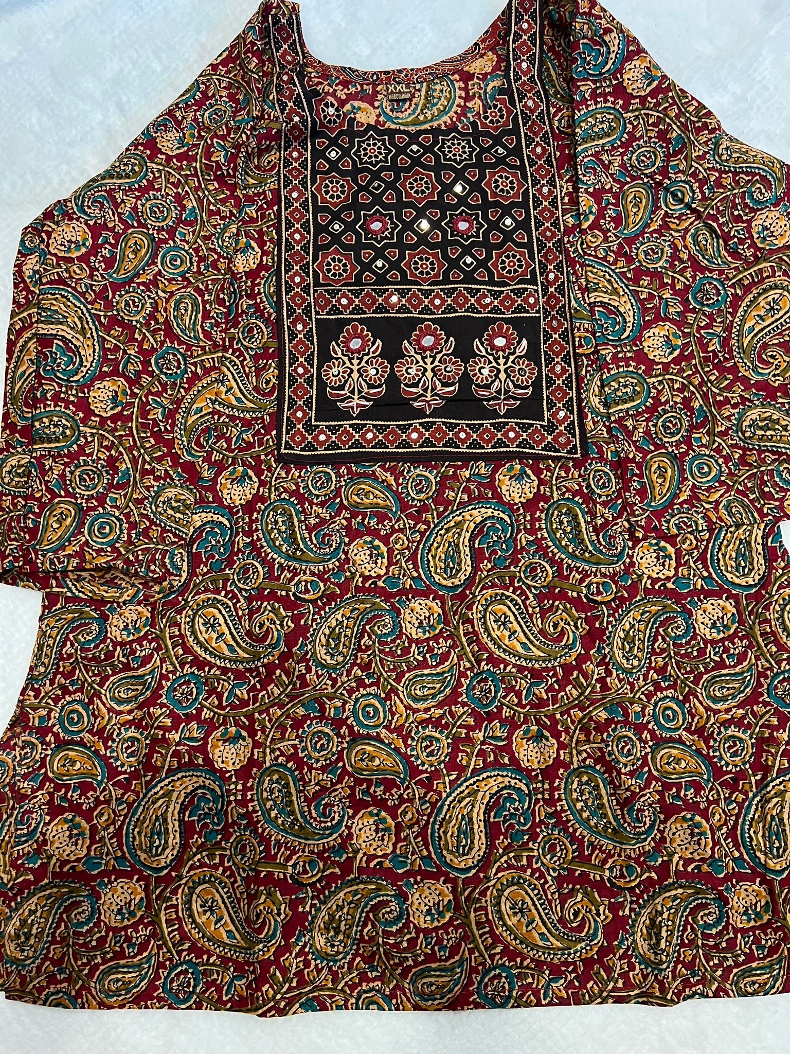 This Mirror Work Short Kurti features intricate mirror embellishments paired with a beautiful printed design, making it an elegant choice for casual wear. Its lightweight fabric ensures comfort throughout the day, while the detailed craftsmanship adds a refined touch to your everyday wardrobe. Perfect for those who appreciate traditional artistry with a modern twist.
