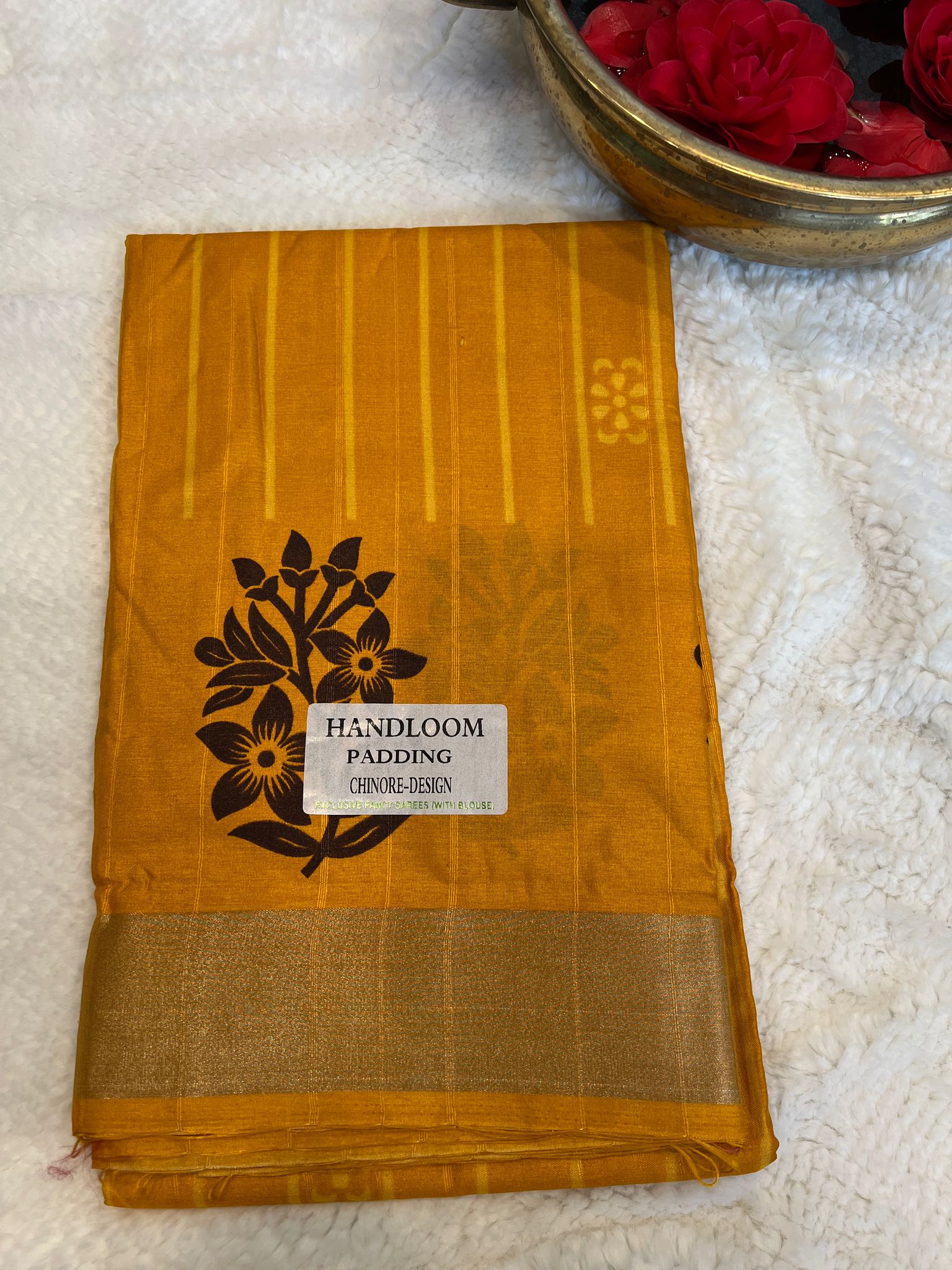 This handloom saree features a lightweight and breathable linen fabric, making it perfect for all-day wear. The contrasting pallu adds a touch of elegance, while the beautiful floral prints make it a unique and stylish choice. Embrace comfort and style with this stunning Handloom Padding Linen Saree.